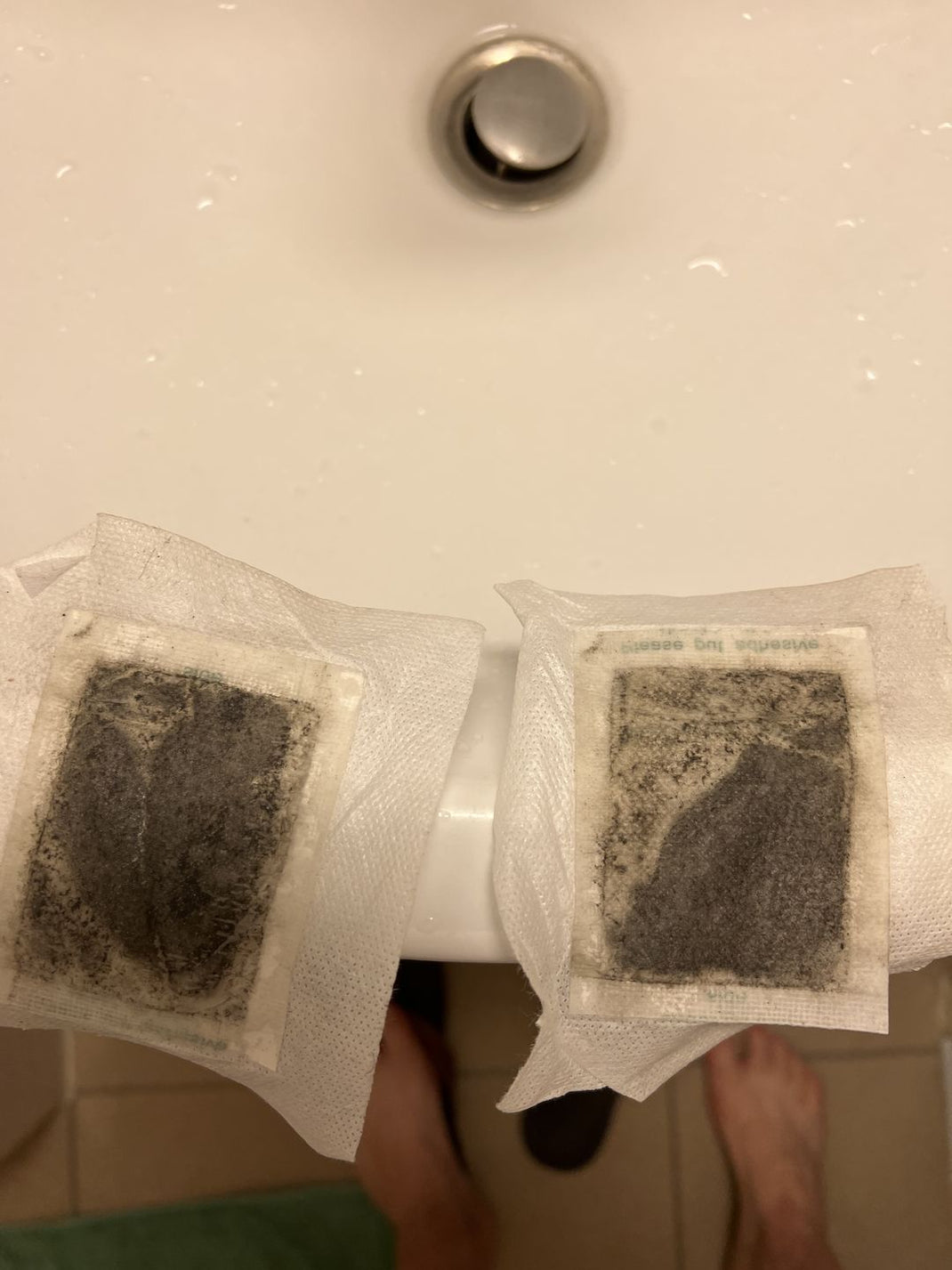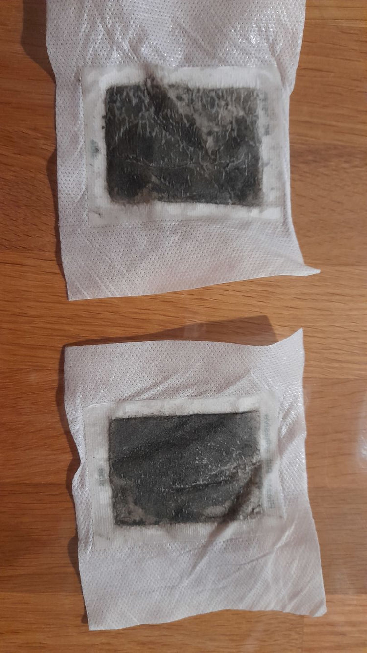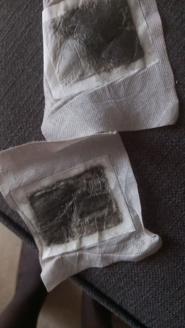 Voilà les photos de quoi est composé 1 sachet. En effet, j'ai lu plein de choses à ce sujet qui m'a fait un peu peur. Donc nous avons 5 petits sachets qui contiennent tous 2 patchs, puis 14 collants pour être rassurée et de peur de tacher mes draps j'ai mis des chaussettes (pas mon habitude, mais plus rassurée). Et vous avez sur les 4 dernières photos le résultat ce matin. Après je n'ai pas assez de recul aujourd'hui pour dire si ça fait de l'effet ou pas. Bien dormi, mais j'ai eu souvent chaud (les chaussettes peut-être)... Après 3 nuits, je dors super bien moi qui me levais entre 5 et 7 fois cette nuit qu'une fois et à 5h, pour un levé à 6h.