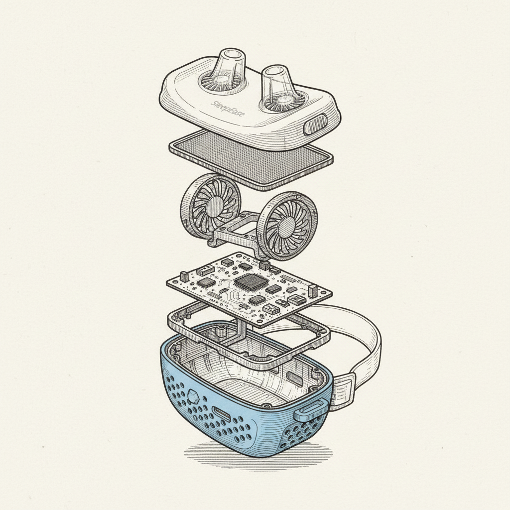 This technical illustration highlights the research, prototyping, and refinement that helped shape SleepEase CPAP. Every curve, vent, and internal element was designed with a clear goal: create a device that feels compact, comfortable, and easy to use night after night.