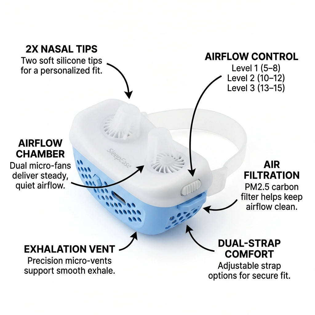 SleepEase CPAP pairs gentle airflow assistance with a lightweight, easy-to-use design to support nighttime comfort. Dual micro-fans help maintain steady airflow through a PM2.5 carbon filter, while interchangeable soft nasal tips and adjustable straps allow for a secure, comfortable fit.